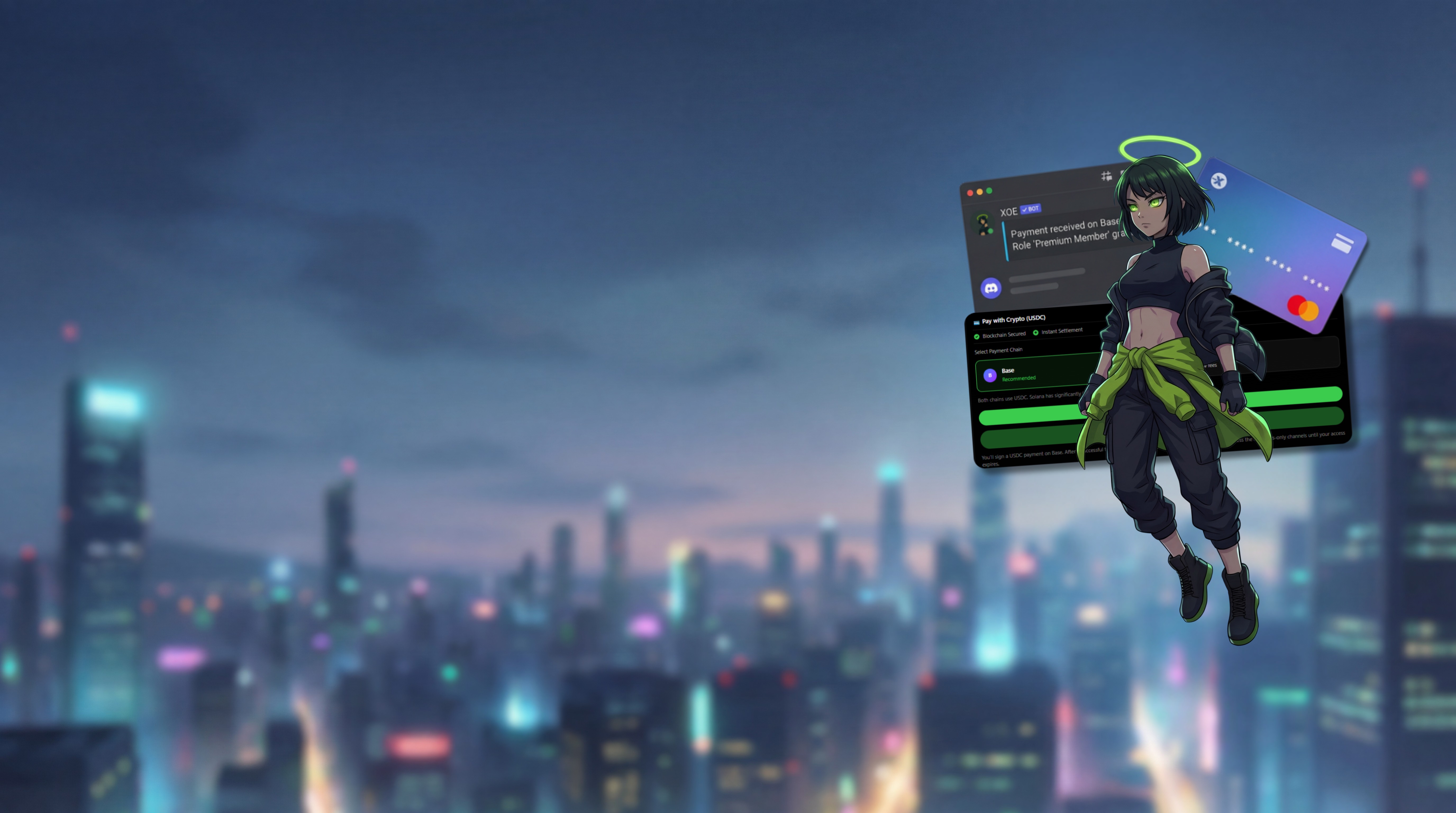 New members land in your XOE channels where they complete a quick human check and pick their plan. They pay in USDC on Base or Solana and XOE confirms everything inside Discord.